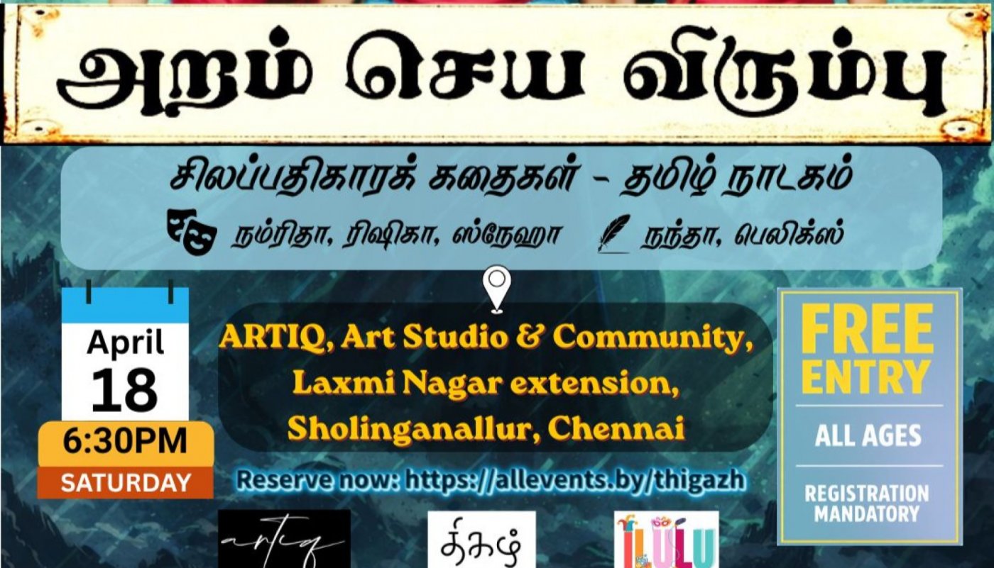 Aram Seya Virumbu is a 60-minute Tamil play inspired by selected stories from Ilango Adigal’s epic Silapadhikaram. The core intent of the play is to explore the many shades of Aram (righteousness), and to reflect on how these values remain deeply relevant in our lives today.