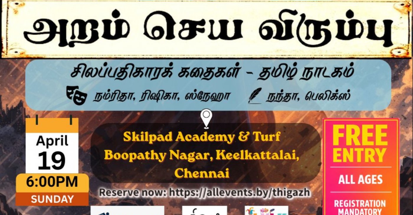 Aram Seya Virumbu is a 60-minute Tamil play inspired by selected stories from Ilango Adigal’s epic Silapadhikaram. The core intent of the play is to explore the many shades of Aram (righteousness), and to reflect on how these values remain deeply relevant in our lives today.