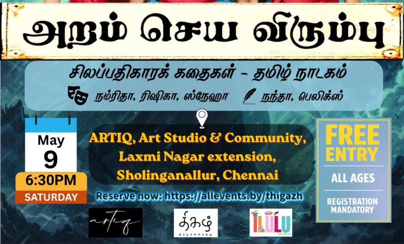 Aram Seya Virumbu is a 60-minute Tamil play inspired by selected stories from Ilango Adigal’s epic Silapadhikaram. The core intent of the play is to explore the many shades of Aram (righteousness), and to reflect on how these values remain deeply relevant in our lives today.