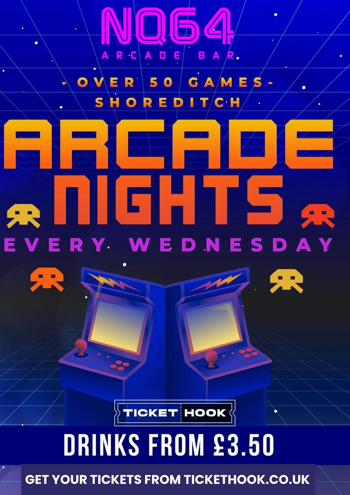 Arcade Night at NQ64 every Wednesday ⭐️Grab your ticket now for our Arcade Nights at NQ64 Shoreditch! Each ticket includes 5 tokens for games on arrival, and student drink prices all night long from £3.50!🍹Over 50 arcade games to choose from in this underground Arcade bar 👀If you're a group or looking for a private booking - send us an email and we can plan the perfect night out for you! [email protected] open at 3pm and entry is permitted until 1 hour before doors close at 2am!
