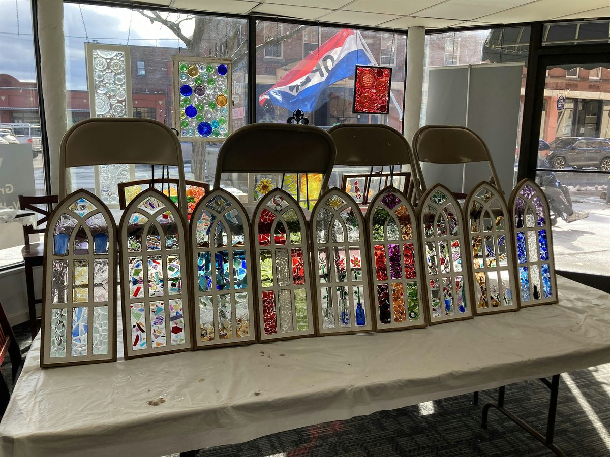 decorate an arch window with pieces of glass and resin to create a one of a kind work of art