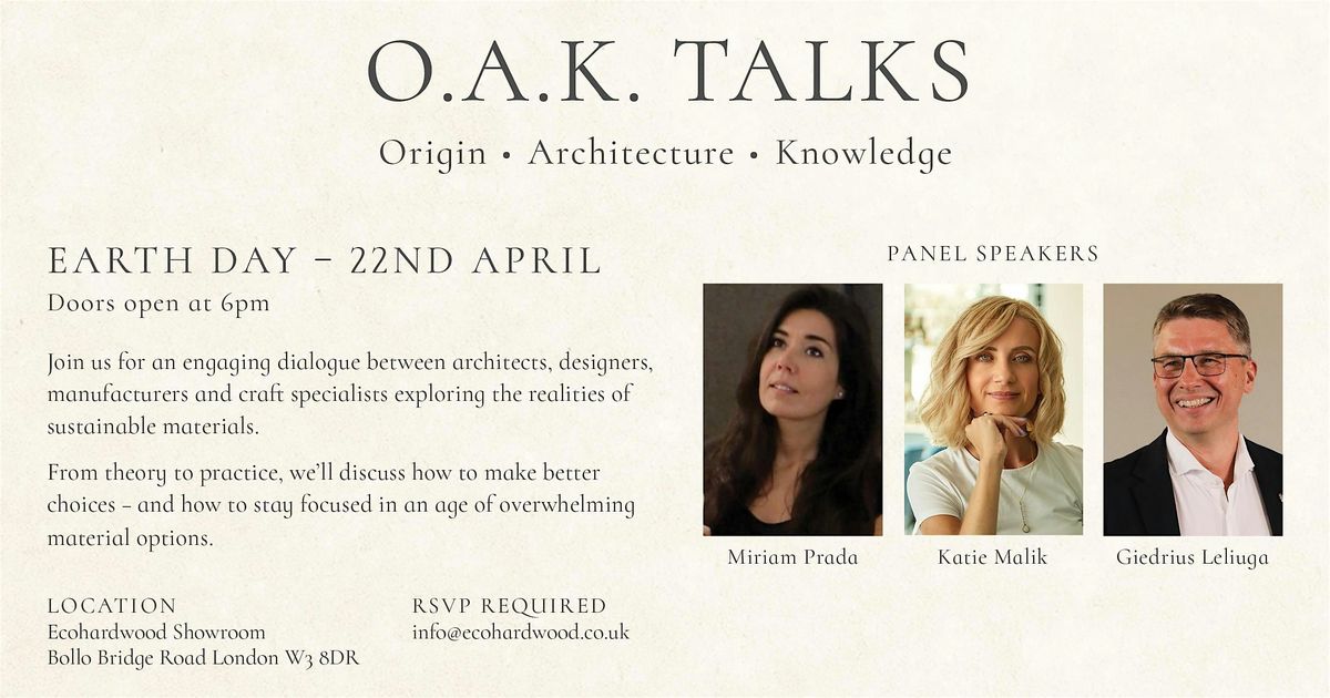 Taking place on Earth Day, the O.A.K. Talks (Origin, Architecture, Knowledge) event brings together experienced voices from design and manufacturing. We’ll talk about how to choose materials wisely, avoid greenwashing, balance cost and sustainability, and build trusted relationships between suppliers and designers.