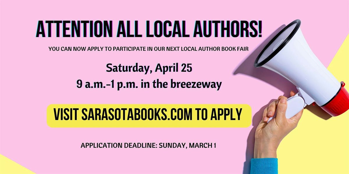 If you're interested in applying for our Local Author Book Fair on Saturday, April 25, please fill out the online application form before Sunday, March 1. You will receive a decision by Sunday, March 8. Because of the volume of applications, incomplete submissions will not be considered. Apply here: https://www.sarasotabooks.com/localauthorbookfair