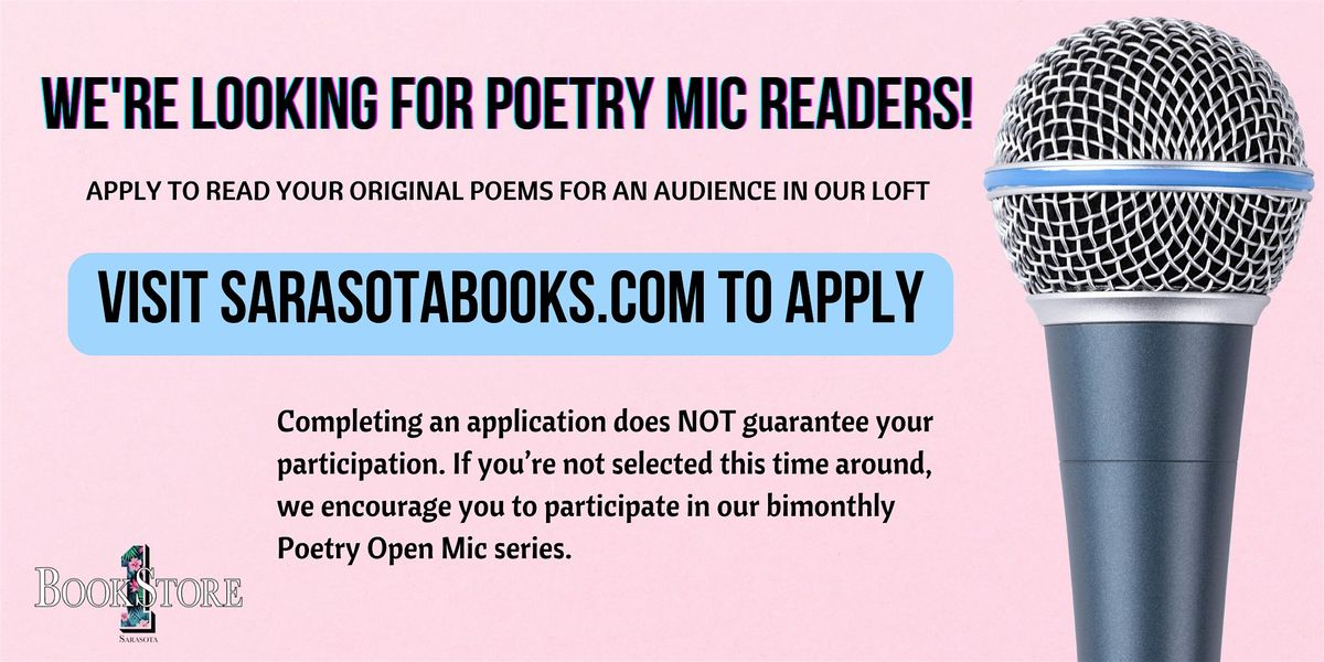 We're looking for poets to read their work as part of our bi-monthly Poetry Mic series! Apply for a chance to read your original poems to an audience in our loft. Applications are accepted on a rolling basis, so stay tuned to find out whether or not you will be added to our calendar of readers. Completing an application does NOT guarantee your participation. Click here to apply: https://www.sarasotabooks.com/poetry