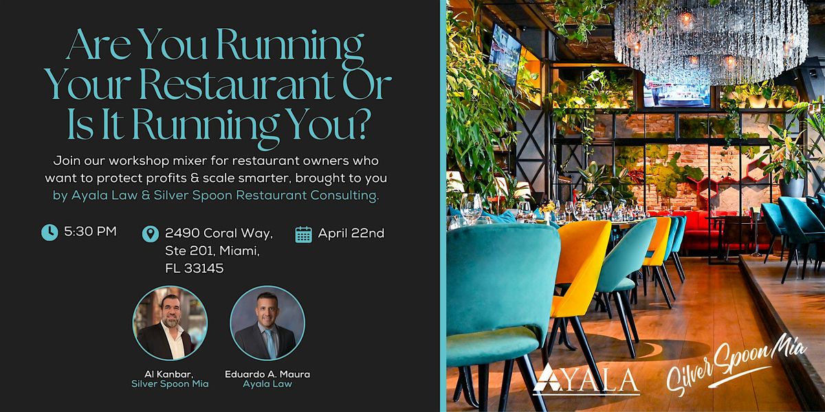 Hosted by business law firm Ayala Law, and restaurant consultants Silver Spoon MIA, Business Law Fundamentals for Restaurant Entrepreneurs is an event built for restaurant owners, bar operators, and hospitality entrepreneurs who want to increase profitability, reduce risk, and run a smarter business.