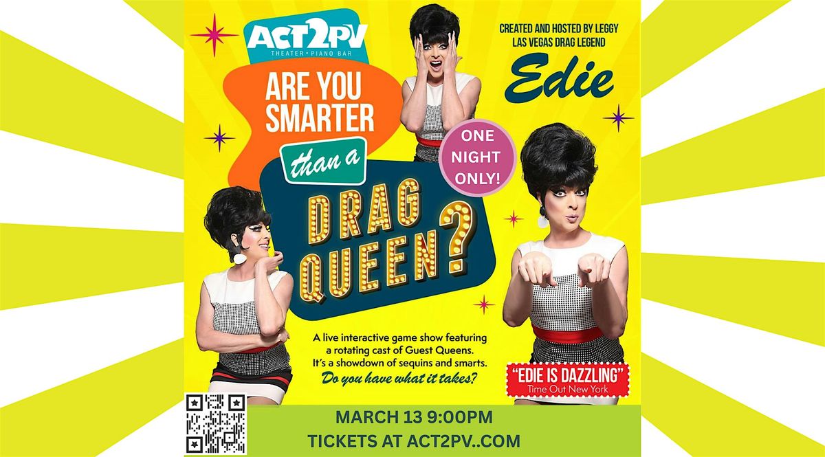Are You Smarter Than a Drag Queen? — the ultimate live interactive game show hosted by the fabulous leggy Las Vegas legend EDIE! In this high-energy, camp-fueled competition, audience members go head-to-head (and heel-to-heel) with a Special Guest Local Drag Queen in a series of hilarious trivia rounds, outrageous challenges, and cheeky surprises. From pop culture and history to LGBTQ+ lore and diva drama, no topic is off-limits — and no answer is too outrageous. Whether you’re a trivia whiz or just here for the sequins, Edie will rally the crowd like only a true queen can. So, are you smarter than a drag queen? There’s only one way to find out…