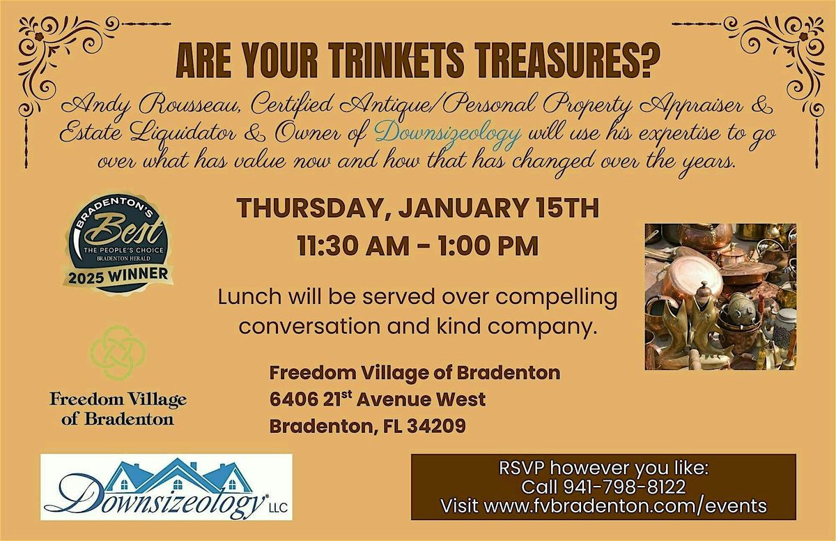 presents , a certified antique appraiser, certified personal property appraiser, certified estate liquidator, and hoarder specialist. He will discuss the items that are down (and up!) in value and how that affects you. Be sure to ask questions. We love to hear them!