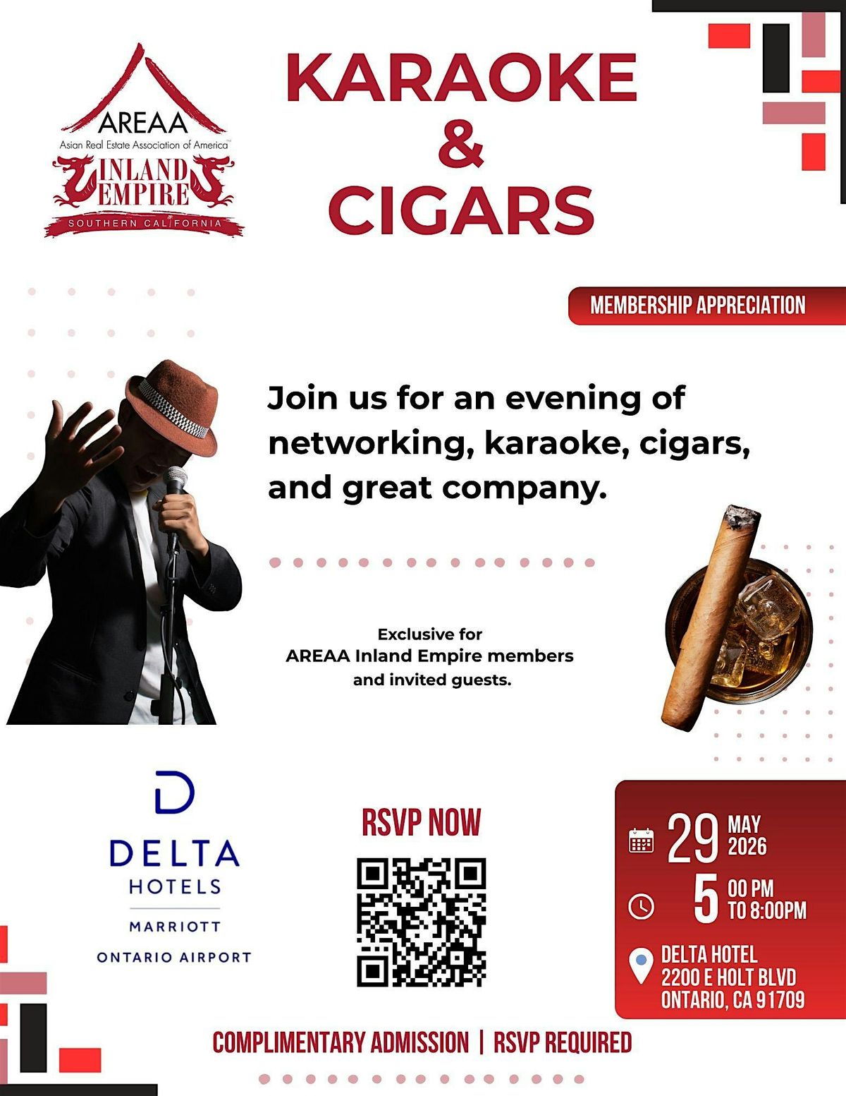 Join us for an exclusive evening of networking, karaoke, cigars, and great company — hosted by the Asian Real Estate Association of America, Inland Empire Chapter!