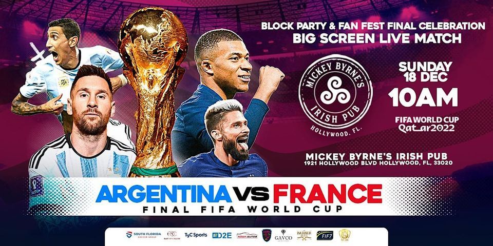 Argentina vs France will take place on December 18 from 10 A.M. at Mickey Byrne's Irish Pub at 1921 Hollywood Blvd, Hollywood, FL 33020