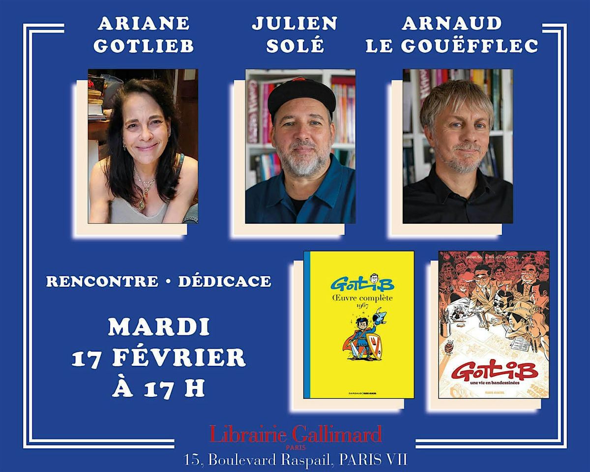 Gotlibiennes, Gotlibiens, rencontrez-nous pour une soirée à la gloire du patron, roi de la bulle et génie de l’absurde. Nous discuterons, avec Ariane Gotlieb, du merveilleux album biographique de Julien Solé et Arnaud Le Gouëfflec et du splendide premier tome d’une collection à tomber par terre de rire en s’esquintant irrémédiablement les zygomatiques.
