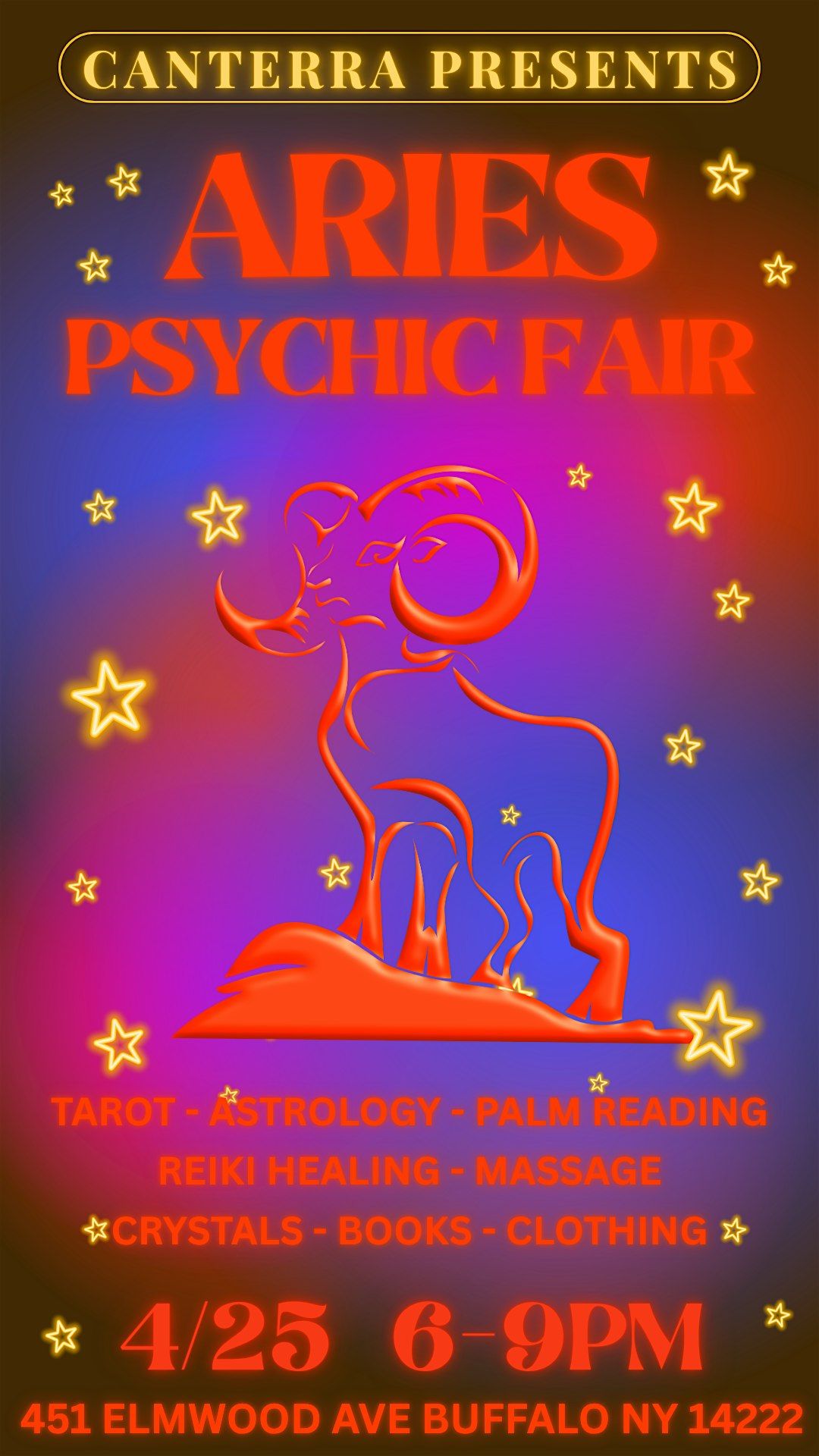 Get ready for an amazing psychic experience at the Aries Psychic Fair happening at Canterra! Whether you're curious about tarot readings, crystal healing, or just want to vibe with amazing spiritual energy, this fair has something for everyone. It's the perfect chance to connect with gifted psychics, explore your intuition, and have a great time. Don’t miss out on this fun and enlightening event!