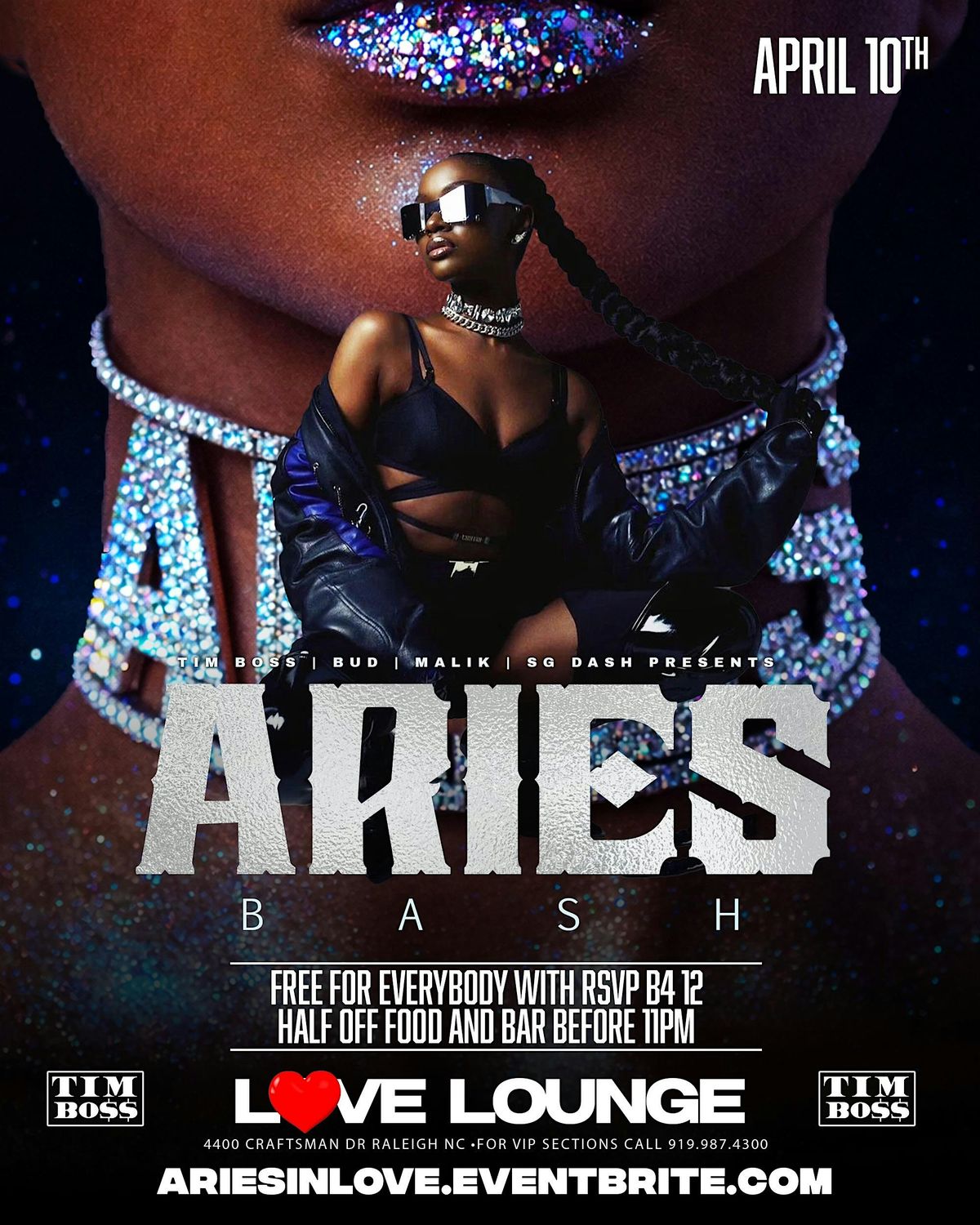 All aries free all night , free for everybody with RSVP before 12 midnight , half off bar and food til 11pm , for vip sections 9199874300