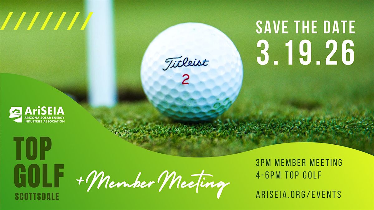 This event is AriSEIA's second annual spring fundraiser and our second biggest event and fundraiser of the year. Top Golf is a great way to build relationships with clients, colleagues, or others in the energy space. Contact [email protected] for sponsorship opportunities. The AriSEIA member discount is only available for member companies of the Arizona Solar Energy Industries Association. Contact Autumn for the discount code. Please arrive 15 minutes early for check in. AriSEIA members should arrive by 3pm for the member only meeting. All others should arrive by 4pm. Food and drinks will be provided.