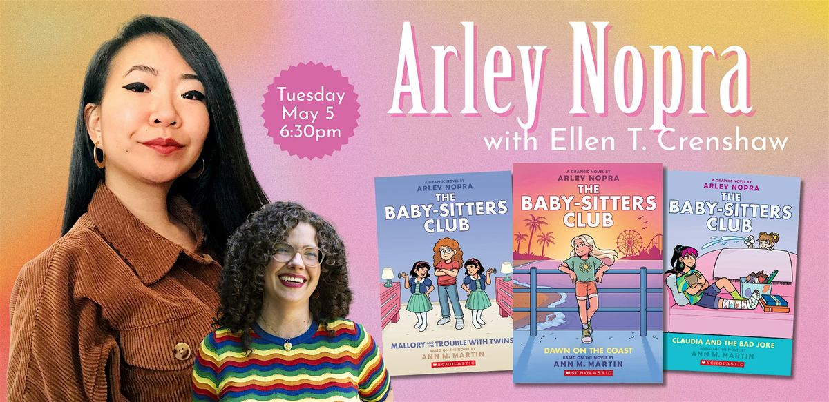 Join us for a very special evening to celebrate the release of Dawn on the Coast (The Baby-Sitters Club #19) with New York Timesbestselling cartoonist Arley Nopra in conversation with Ellen T. Crenshaw, the creator of the New York Times bestselling Baby-sitters Club graphic novel adaptations of Stacey's Mistake, Kristy and the Walking Disaster, and Jessi's Secret Language by Ann M. Martin!