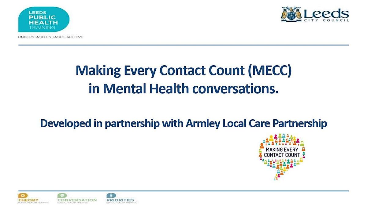 A bespoke Armley Mental Health Making Every Contact Count (MECC) training has been developed by Armley LCP. This training session is to upskill professionals and volunteers working within the Armley LCP area tending to peoples’ wider determinants of health. This session will:
