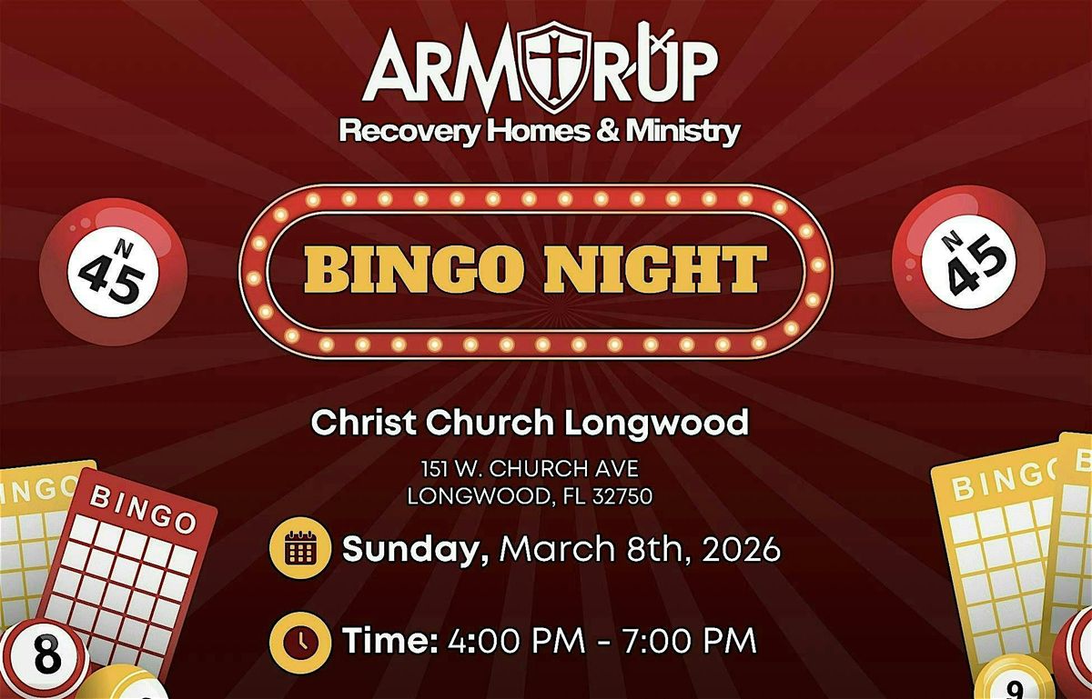 Let's have some fun, food, lots of laughter, and win some big cash at the same time. Located at Christ Church in Old Downtown Longwood on Sunday, March 8th from 4-7pm. This fun event will help support Armor Up your local 501C3 dedicated to helping women and families change their stories by working on lasting inner healing, deliverance, and transformation from all addiction and destructive lifestyles. We are strong advocates in every facet of the recovery community.