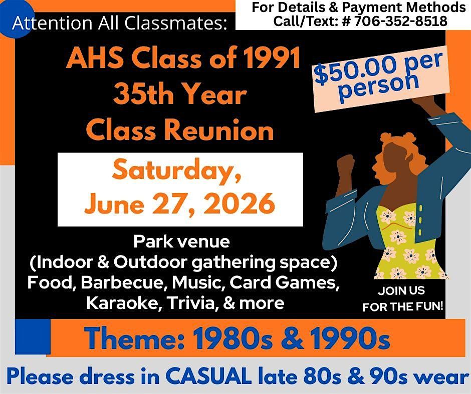 The Armstrong High School Class of 1991's 35th year Class Reunion is scheduled for Saturday June 27, 2026 from 4:00pm - 9:00pm at the Math & Science Innovation Building in Richmond, VA. Classmates may invite a partner/spouse or "plus one." Class of '90 & '92 may attend. $50 per person registration fee. Please register and make payment in advance before May 31, 2026. Payments may also be made to Cash App at $AHS91ClassReunion. Music/DJ, Food, Barbecue, Card Games , Karaoke, Trivia, and more. Fees due by May 31, 2026. Theme: Back to the 1980s & '90s. Please dress in CASUAL '80s & '90s wear. Call/text 706-352-8518 for more info and other methods of payment. Classmates will be asked to bring monetary donations so that the AHS Class of 1991 may make a monetary donation to be presented to the current AHS Senior Class for senior graduation dues & much needed personal items for those in need - ADOPT AHS's SENIOR CLASS.