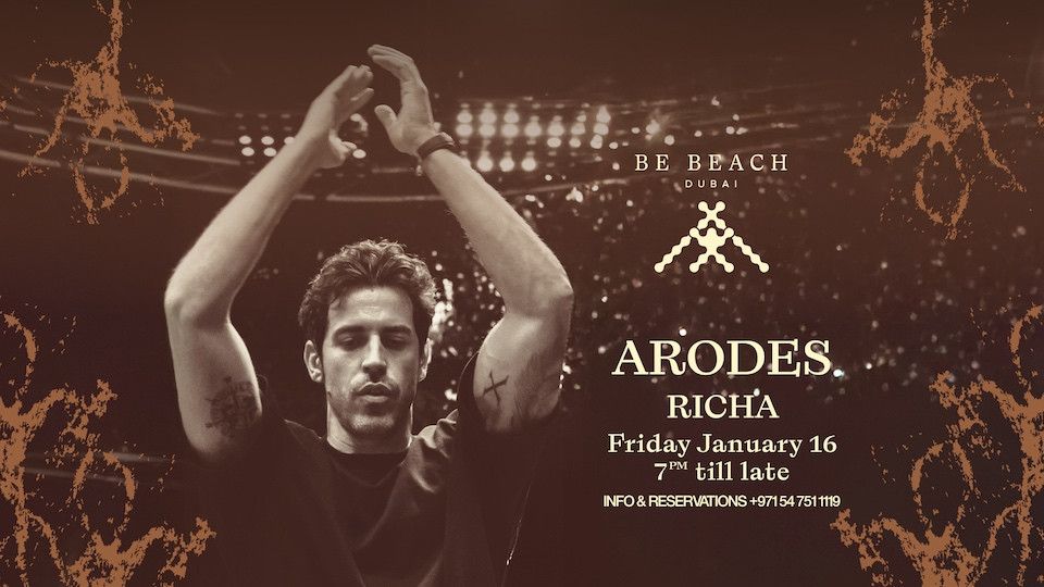 - Be Beach Dubai welcomes Arodes for a powerful Friday night of deep, emotive electronic music at Dubai Harbour. Known for his driving grooves and emotionally charged sound, Arodes delivers sets that balance intensity with depth, blending melodic techno and underground energy into a compelling dancefloor journey. His performances are raw, immersive, and designed to build momentum from sunset into the late hours.