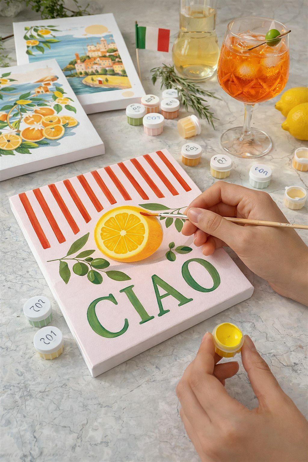 Guests will enjoy a guided paint-by-numbers experience featuring iconic Italian-inspired imagery. Think Amalfi coastlines, Tuscan villas, vespa moments, and timeless European charm. No painting experience required! Come ready to relax, sip and create.
