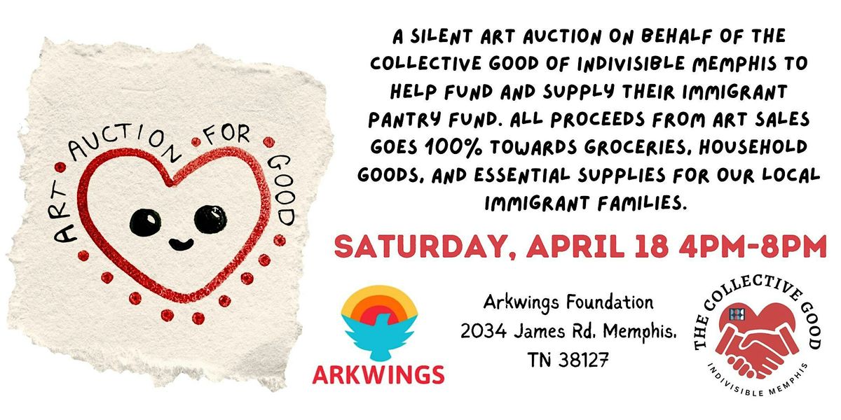 A charity silent auction event on behalf of The Collective Good of Indivisible Memphis to support their Immigrant Pantry Fund. Their collective is fueled by admirable volunteers who take action in providing groceries, household goods, and essential items to our local immigrant families that may feel unsafe or are unable to commute for their home supplies. We have 40 local artists who have graciously donated their arts, goods, and services to help raise funds for the pantry fund. All proceeds from art sold goes 100% to the fund. Come join us for a night of community, art, and music and bring a friend! Free to attend! Register with this Eventbrite Page Below! Saturday, April 18 4pm-8pm