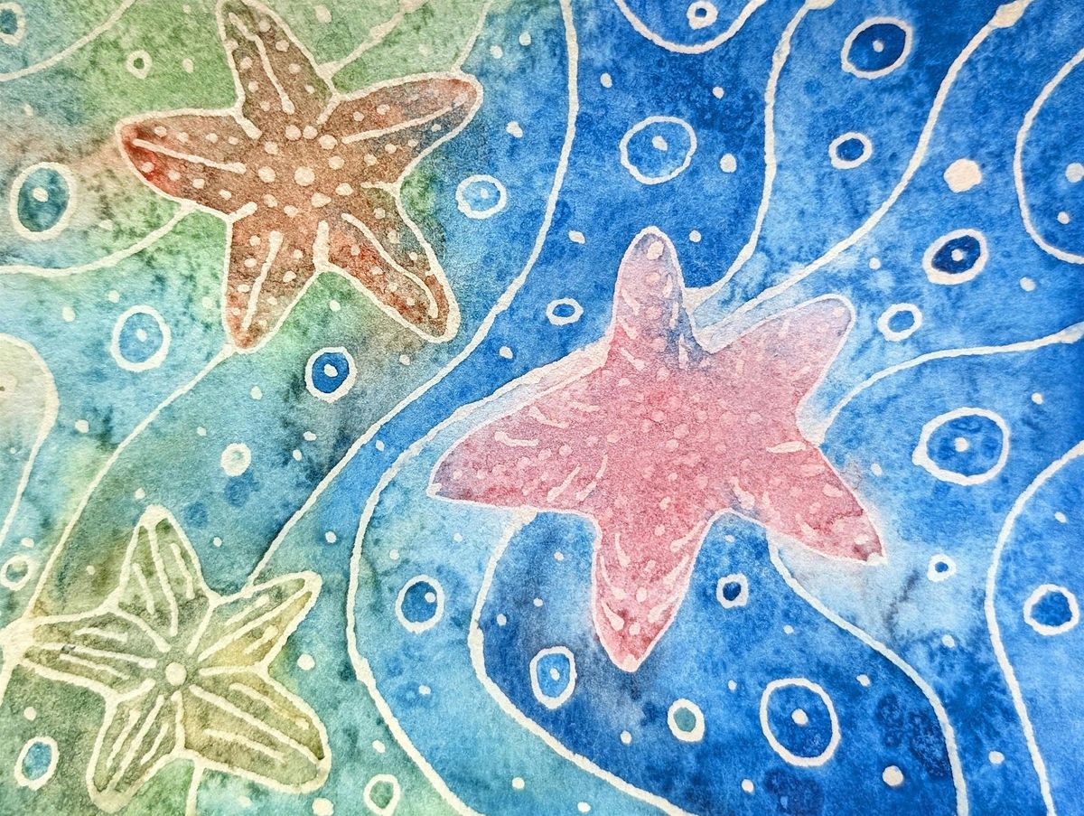 Join us for a relaxing and meditative watercolor painting experience. I will have drawings prepared using watercolor masking fluid. Participants will use wet on wet techniques, wet on dry techniques, salt and sgraffito to "color in" areas. When dry, participants will rub off the masking fluid to reveal bright white lines around painted areas. This masking fluid technique has been likened to the Batik wax resistant technique on cloth.