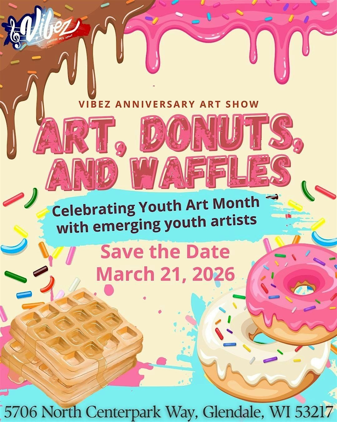 Get ready for the sweetest art show of the year! In honor of Youth Art Month, the 2026 Art, Donuts & Waffles Anniversary Art Show is back and this year it belongs entirely to the next generation. Featuring exclusively young artists ages 6–18, this incredible showcase brings the theme "Fresh Perspectives, Bold Futures" to life through the fearless, vibrant, and imaginative work of our community's brightest young creatives. And did we mention the food? Mouth-watering donuts, incredible waffles, and all the good vibes you can handle make this so much more than an art show — it's a full-on experience. Come celebrate the future of art, support young talent, and treat yourself to something delicious. Trust us, you don't want to miss this one!