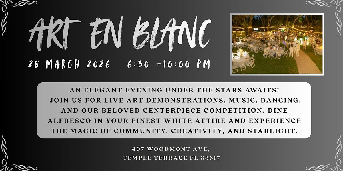 Welcome to Art en Blanc 2026 - Temple Terrace Style! Join us at the beautiful, historic Woodmont Park on March 28, 2026 at 6:30 PM. Get ready for an evening filled with creativity and inspiration. Don't miss this opportunity to immerse yourself in art and culture in a unique setting.