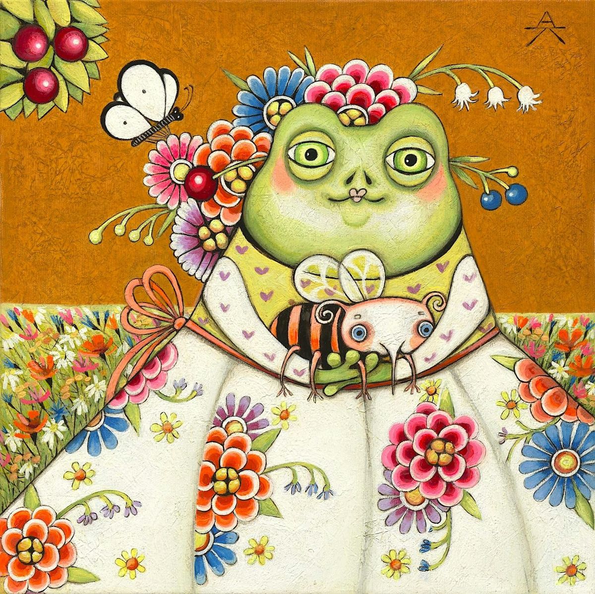 Alyona Krutogolova is a contemporary Ukrainian artist based in Kyiv, known for creating a distinct "happy island" through her whimsical and decorative paintings. Her work is characterized by a unique synthesis of traditional Ukrainian folk art and naive art elements, filtered through a modern, ironic lens.