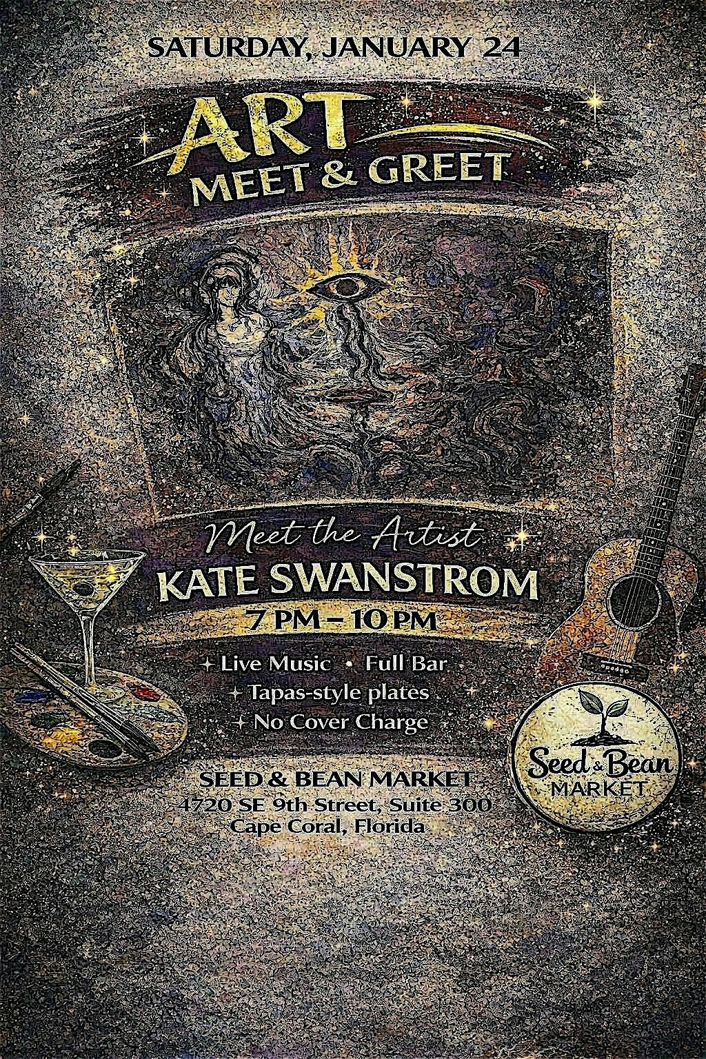 Join us for an evening of art, connection, and creativity.Meet visual artist Kate Swanstrom for an intimate Art Meet & Greet featuring a curated gallery experience, live music by keila esther, appetizers, and a full bar by Seed and Bean .