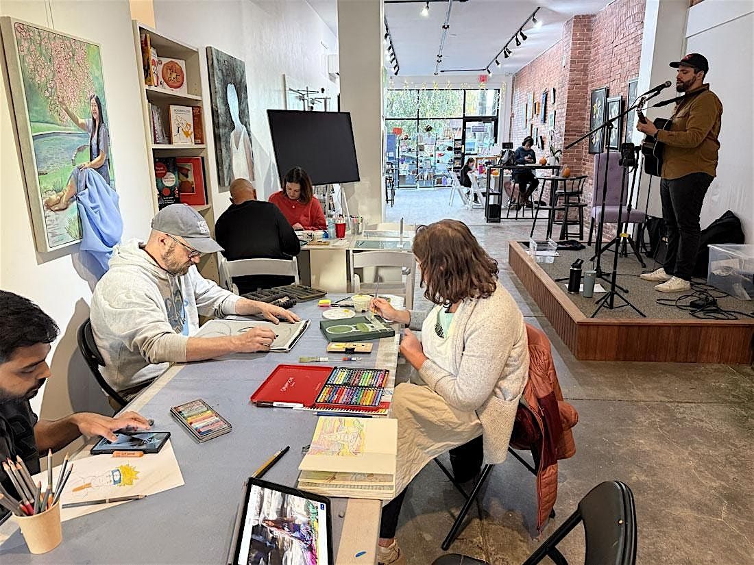 Enjoy live acoustic music while you create on Saturdays 4-6. Get inspired with your friends, family, or on your own! Your base session includes a wide selection of drawing materials and specialty papers. When you arrive, you’ll be able to choose your supplies from our art menu, with the option to upgrade to wet mediums or mixed media combinations. For inspiration, pick objects from the still life buffet, a guided NH-themed prompt, a National Geographic photo reference, a self-portrait mirror, an expressive art stencil, take a Polaroid to work from, or bring your own project.