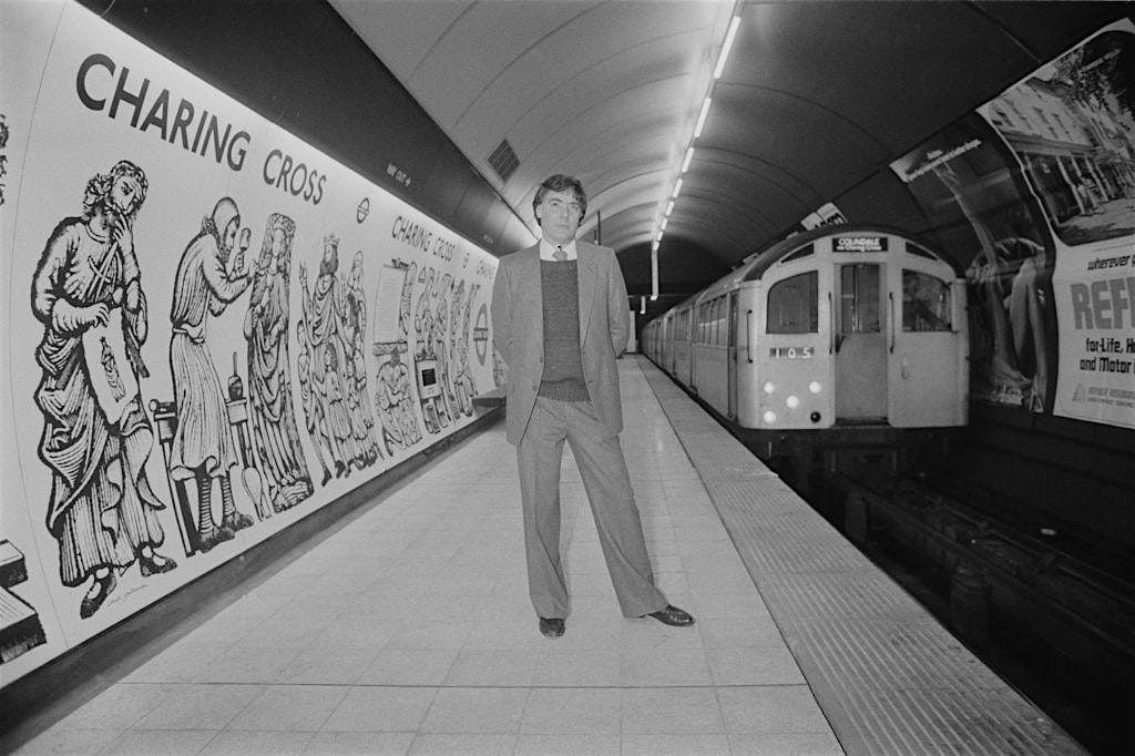 Image Credit: British artist David Gentleman at the newly opened Charing Cross Underground Station which features his mural, London, Uk, 13th March 1979. (Photo by Evening Standard/Hulton Archive/Getty Images)