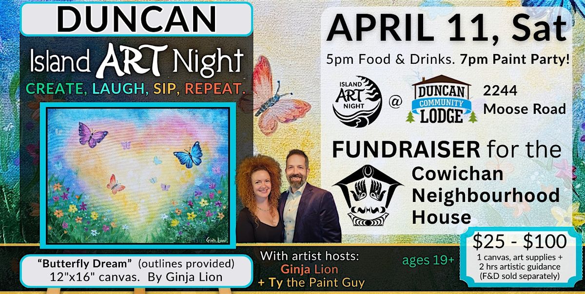 Join us for a special Island ART Night fundraiser in honour of Ginja’s mum, Pam Carss, supporting the Cowichan Neighbourhood House Association. Pam volunteered for many years with Neighbourhood House, helping families and strengthening our community. All ticket proceeds from this event will go directly to support their important work.