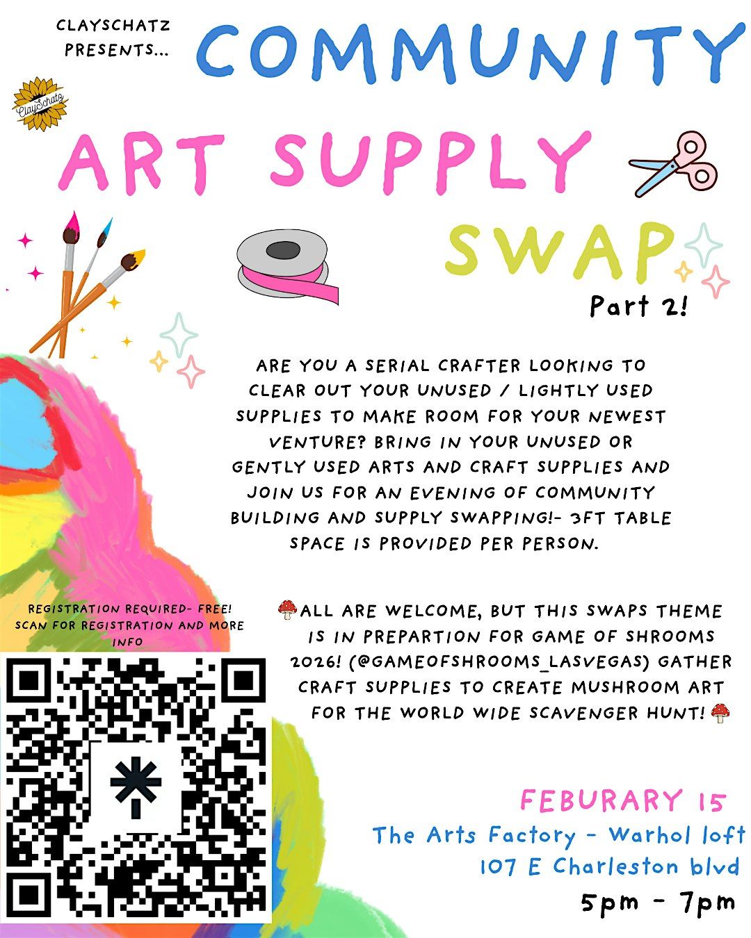 Please arrive between 4:30-5:30 pm. Each ticket includes a 3ft table space. Free street parking, paid lot parking if street parking is not available. Any unwanted supplies can be left with us to use for free community building events, as well As items being donated to a local DV shelter for their arts and crafts program.