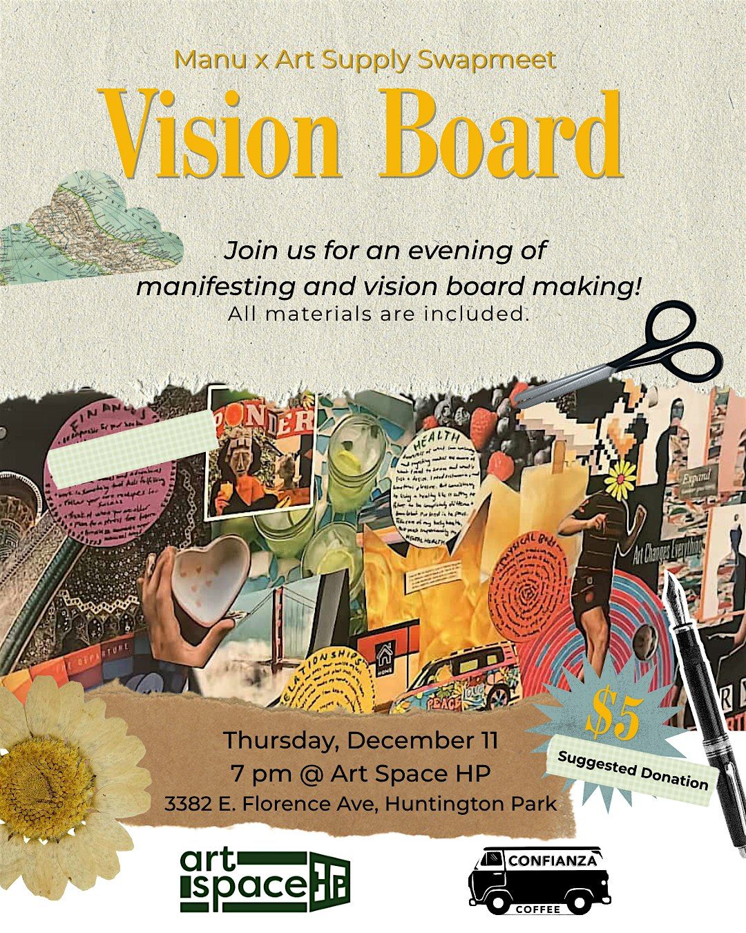 Come join us for a fun and creative afternoon at Art Space Huntington Park to make your very own vision board! This in-person event is a great opportunity to visualize your goals and dreams for the future. Grab some magazines, scissors, and glue, and get ready to bring your aspirations to life on a board. Whether you're looking to manifest success, happiness, or new adventures, this event is perfect for anyone wanting to set intentions and work towards their dreams. Don't miss out on this chance to get crafty and inspired!