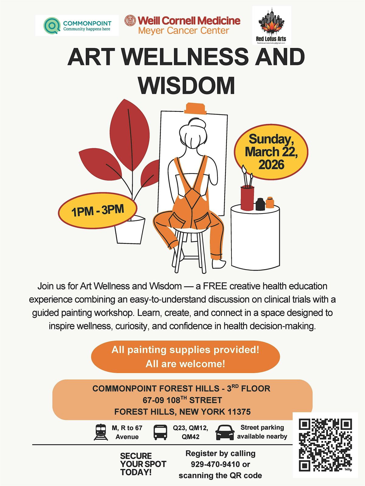 Join us for an amazing FREE event that combines the power of art, wellness, and wisdom! Get ready to be inspired, uplifted, and rejuvenated at Commonpoint Forest Hills, located on 67-09 108th Street in Forest Hills, Queens. This in-person event is a unique opportunity to explore your creativity and nourish your mind as we learn about clinical trials, an important yet often misunderstood option for cancer care. We start by following our instructor, Julia Kirtley, as she guides us in a painting. As our paintings are drying, we take some time to learn about clinical trials. At the end of the event, you'll leave with new information and a new painting! All are welcome and all painting supplies will be provided!