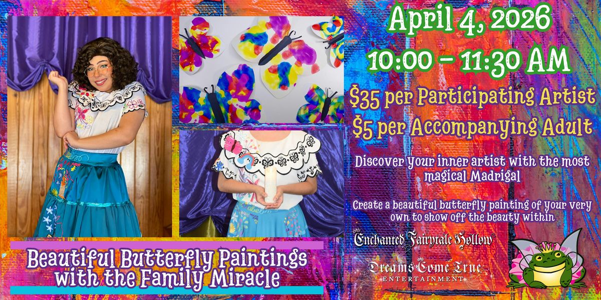 Each child artist is required to have an adult accompanying them. If you have additional guests participating, please purchase another ticket for each guest and if you have additional Accompanying Adults, they must also purchase an Accompanying Adult ticket sinceo ur new kingdom has limited space. Art projects will be taken home the day of the class unless the class is part of a special series class where it will be worked on over multiple sessions. (This Session includes: The Family Miracle helping all of our royal guests create their own butterfly painting-1 Session Class)