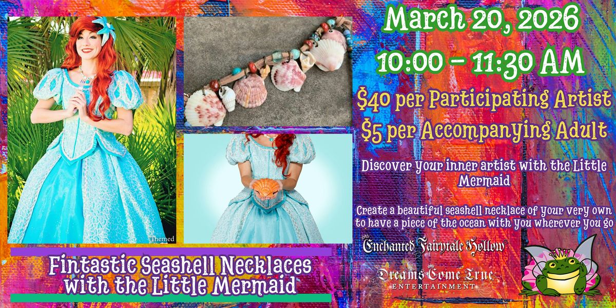 Each child artist is required to have an adult accompanying them. If you have additional guests participating, please purchase another ticket for each guest and if you have additional Accompanying Adults, they must also purchase an Accompanying Adult ticket sinceo ur new kingdom has limited space. Art projects will be taken home the day of the class unless the class is part of a special series class where it will be worked on over multiple sessions. (This Session includes: The Little Mermaid helping all of our royal guests create their very necklace made of seashells-1 Session Class)