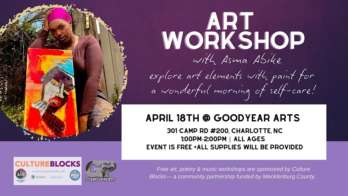 Get ready to unleash your creativity in this fun, in-person art workshop led by the talented CLT artist Asma! Whether you're a beginner or a seasoned artist, Asma’s hands-on guidance will inspire you to create something amazing. Come join us, meet fellow art lovers, and dive into a world of colors and creativity. Don’t miss out on this awesome chance to explore with paint and have a blast! All ages are welcome and all supplies will be provided for you.