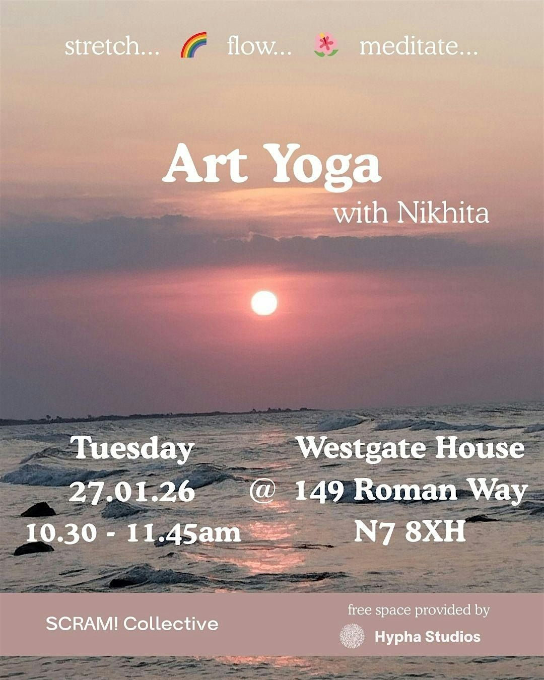 Join us for a morning of creative yoga with Nikhita Devi. The session will consist of a short sketching exercise at the beginning and end of a yoga lesson which has been designed to stretch and relax the body, invigorate the mind, and encourage creativity.