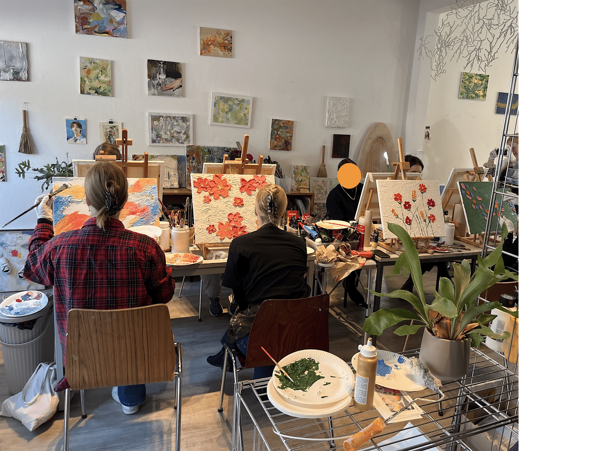 Der Kurs findet im aktuellen Atelier der Künstlerin statt – einem großzügigen und gemütlichen Raum, in dem Du die besondere Erfahrung machst, gemeinsam mit der Künstlerin zu malen.