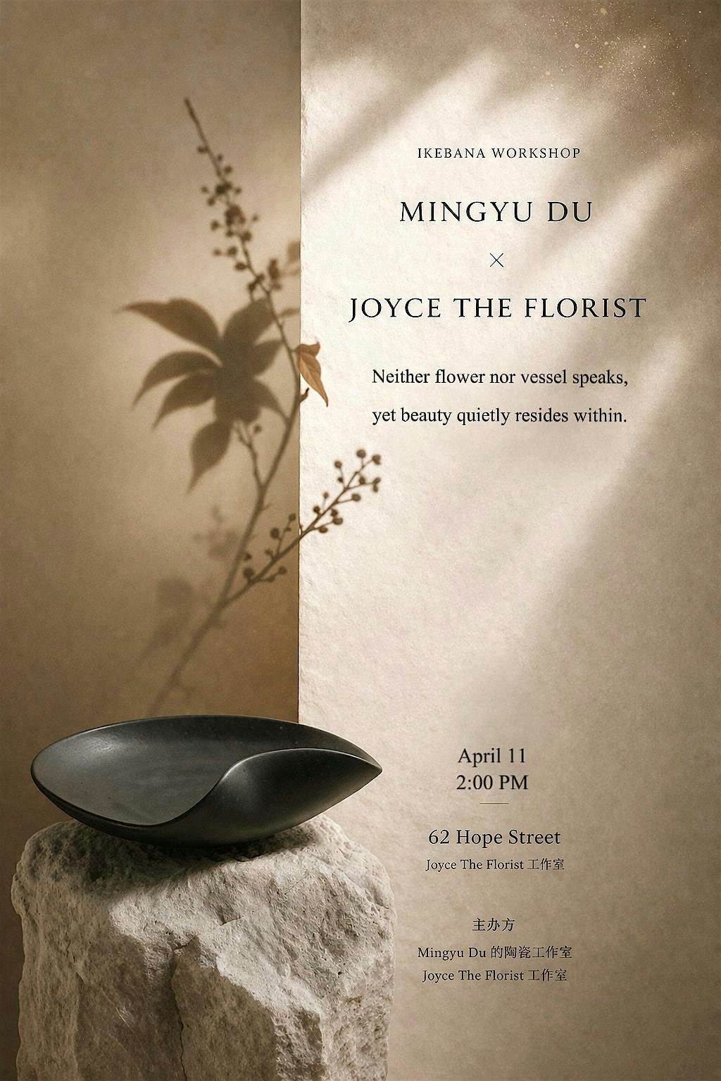 This special workshop brings together the beauty of ikebana with the charm of handcrafted ceramics. Using vessels specially made for this event by ceramic artist Mingyu Du, you will create a floral arrangement that responds to the shape, feeling, and character of each unique piece.