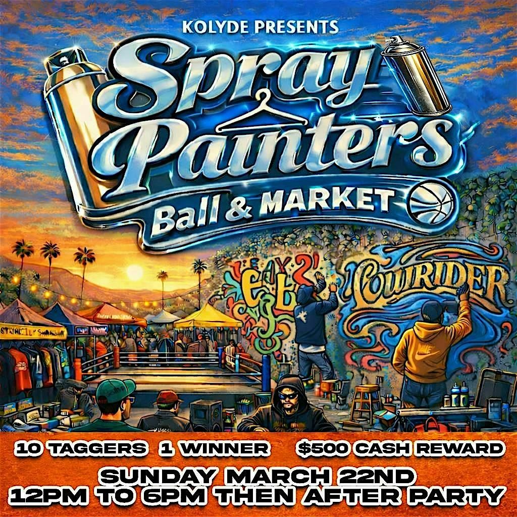 Having a fun event with the homies in back of the Kolyde store. The Event is FREE to attend. The event will consist of 10 artist battling it out for a $500 cash prize (and a large custom plaque) for best spray painted mural. They're will be free refreshments (stay hydrated), a couple of dj's will be spinning some music cool jams, different types of vendors, vintage clothes, photobooths, yard sellers, food vendors, and other interactive activities.