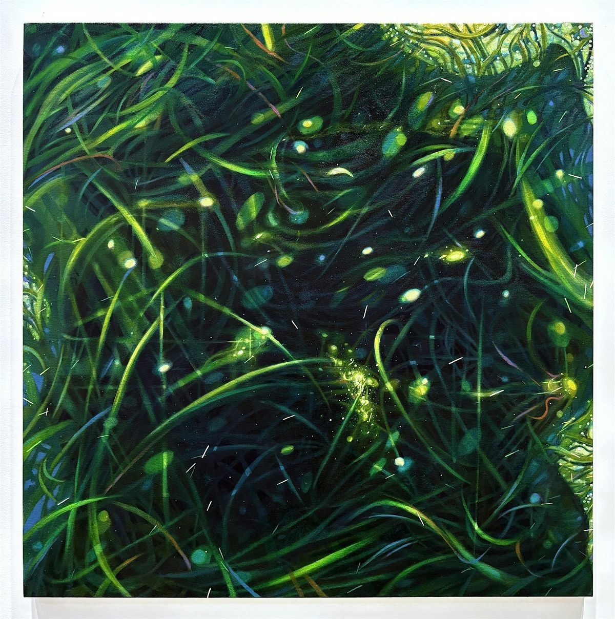 anchors the exhibition in the vibrant, aquatic ecosystems of the Pacific Northwest. Drawing from extensive fieldwork at Botanical Beach, located on the Southern coast of Vancouver Island, Chen subverts traditional landscape tropes by adopting an “aquatic thinking.” Her canvases, characterized by thin glazes and heavy impasto, mimic the depth of the intertidal zone. By rendering kelp in the hues of oxygenated blood, yellow ochre, and deep cobalt, she positions water not merely as a subject, but as a vital “tissue” that connects human and more-than-human bodies. Her work invites us to “swim along the current,” embracing the fluid boundaries of the natural world.