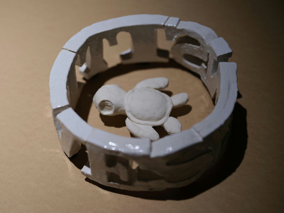 Images: Installation detail, Queering the straight line (Sensitive with pink turtle pyjama bag), 2025. Ceramic, found objects, single channel video, audio. Courtesy Mark Wilson.