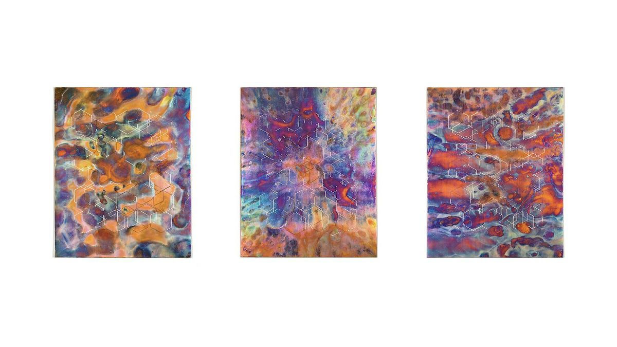 1 - 2) Isabel M. Martinez, Looking at a Glass of Still Water #1, #2, #3 (left to right), 2023. Etched copper, heat, oxidation, light-sensitive compound, UV protection topcoat, 10" x 8" each. The second image is a detail of the artwork.