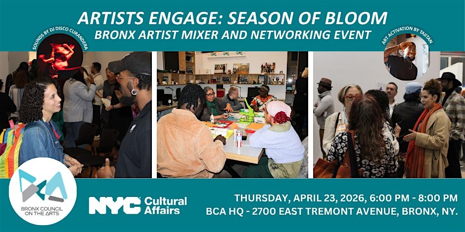 We’re excited to invite you to Artists Engage: Season Of Bloom at BCA HQ (2700 East Tremont Avenue, Bronx, NY, 10461) on Thursday, April 23, 2026, from 6:00 PM – 8:00 PM. Our Artists Engage series is designed to create opportunities for Bronx artists across disciplines to network, unwind, and share ideas in a warm and welcoming space.