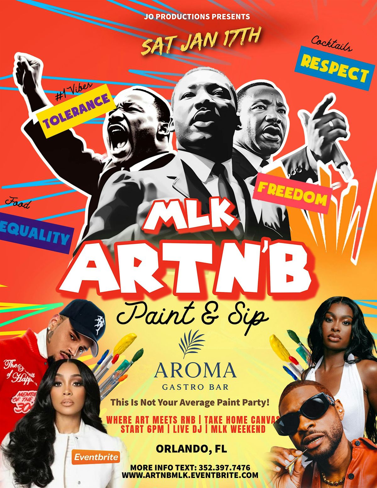 A day filled with RnB classics , dance, art and vibes that touches the soul you cant miss Art&B 2026. This is not your average paint party. Cocktails, Vibes, and an all around Good time. Be sure to cop your Paint & Sip ticket to indulge in some art of your own. The vibes will be like none other stopping at a city near you. This edition is all about the Celebration of MLK At the all New Amora Gastrobar in Orlando.