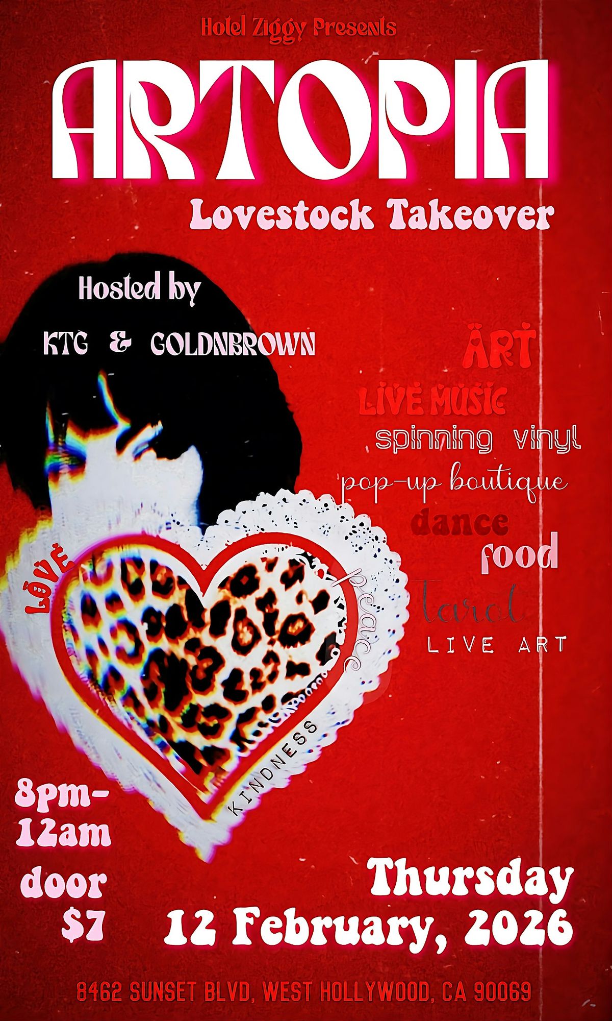 Presented by The Hotel Ziggy, Artopia is back for another exceptional evening of inspirational vibes! We invite you to celebrate the season of LOVE with us! All Artopians and Artopia lovers are welcome! The world needs more love! SO, come share in the LOVEstock vibes! We will be spreading love, peace, and joy through art and live music!