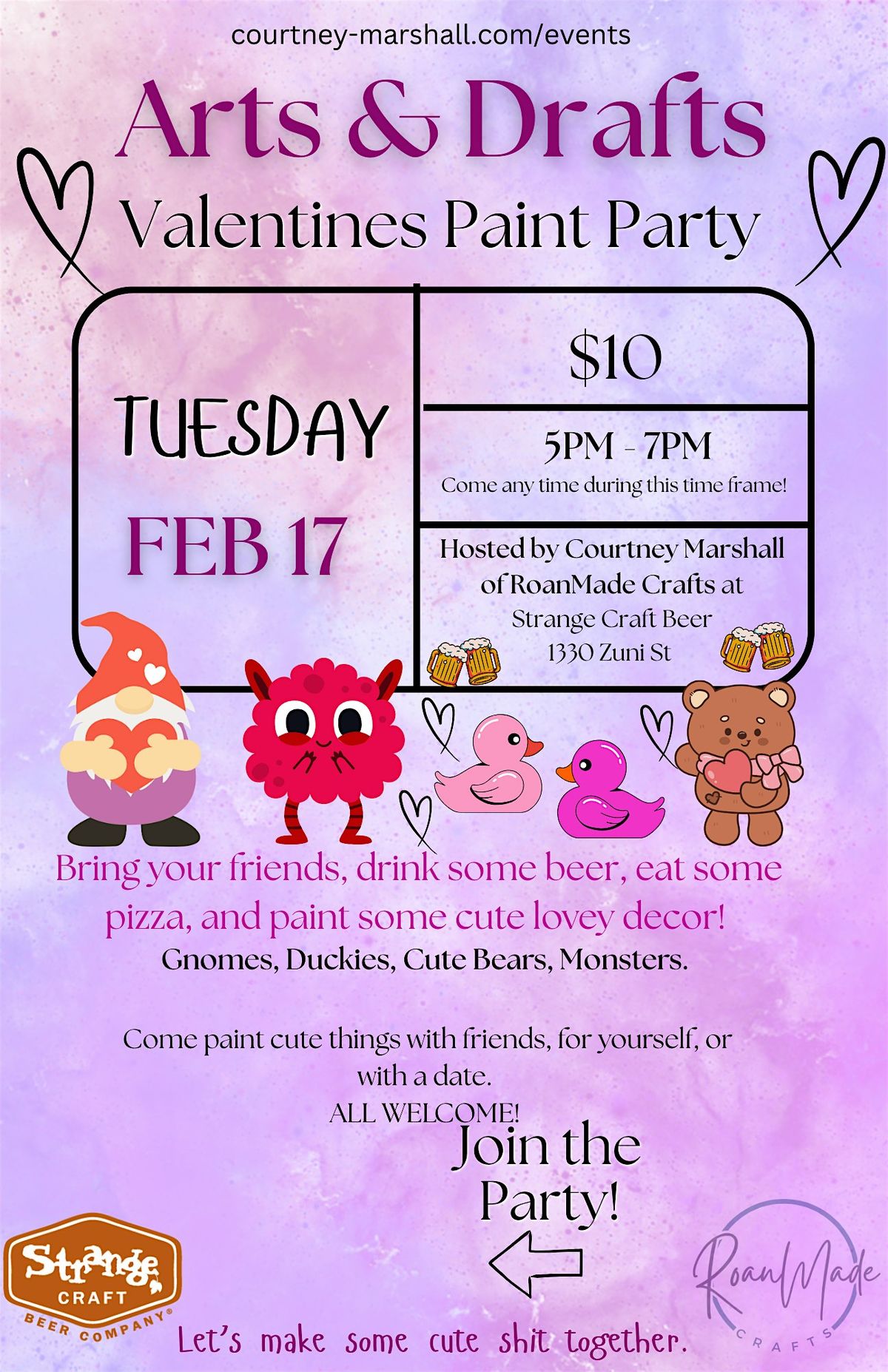 Join Courtney Marshall of RoanMade Crafts at Strange Craft Beer Company on Tuesdsay February 17th any time between 5pm-7pm to paint some cute Lovey decor!