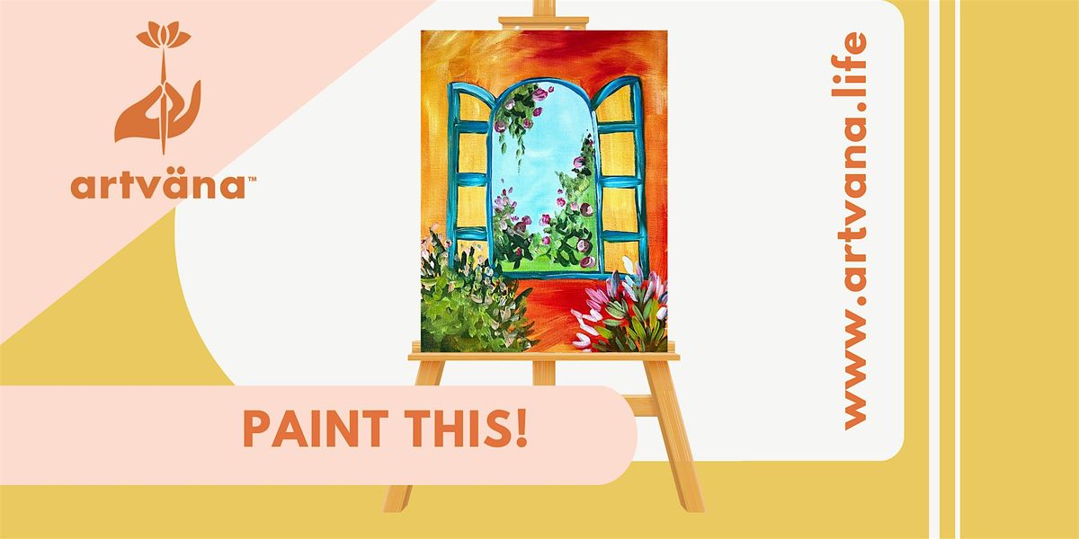 🖼️ What We’re Painting: We’ll guide you step-by-step through the “Blue Window”, a whimsical piece of artwork. In this class, you will be painting this Artvana origianal on canvas to take home and hang up!